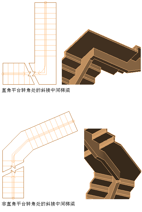 当“转角处的曲线中间梯梁”选项处于清除状态时,中间梯边梁将进行斜接,以便与平台转角的角度相匹配。在多数情况下,这将是一个直角,但任何其他角度也是可行的。