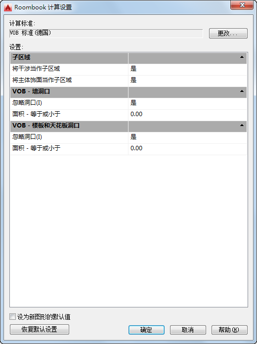 - 当然,您可以对规则定义例外,这表示可计算各个洞口而不管其大小如何。通过单击“VOB 计算”,这些单个更改操作可以在“计算房间土方量子区域”对话框中进行。如果不希望执行符合 VOB 标准的土方量计算,而是要计算实际土方量,只要将这两个选项设置为“忽略洞口: 否”即可。这样,将计算所有洞口而不管其大小如何。