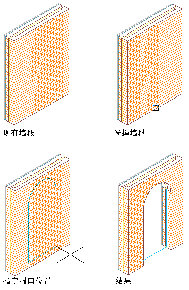 | 在墙上放置洞口 | 选择墙,然后沿墙指定插入点。 |