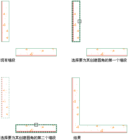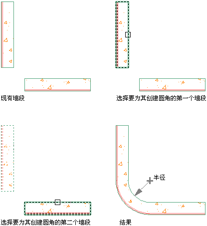 下图显示了如何使用指定的半径按圆角形式连接两个墙段。