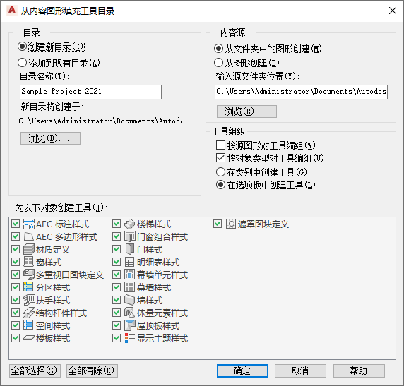 注: 如果同时启用这两个选项,目录将先按图形、再按对象类型编组,从而根据图形生成类别,根据对象类型生成选项板。之所以这样,是因为选项板不能嵌套。在这种情况下,类别和选项板的单选按钮将被禁用,并且将为目录选择“在选项板中创建工具”选项。