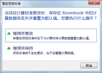 - 当您不希望更改标准并希望保留以前的标准时,单击“否”可取消操作。所有以前所做的 Roombook 计算和手动调整将保持不变。