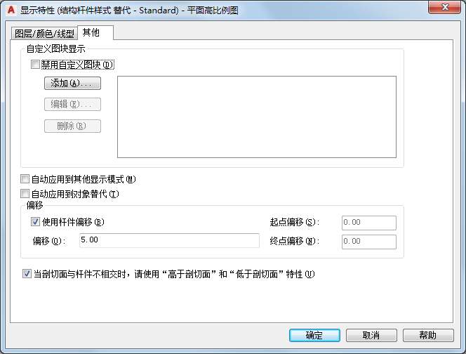 “平面高比例图”显示模式会以简单的线条和弧显示杆件。可以使用此显示模式创建以单线模式显示柱的俯视框架平面。“平面高比例图”显示模式包括两个显示构件,即“梁草图”和“支撑草图”。可以修改这些构件的显示特性(如图层、颜色和线型)以区分梁和支撑的显示。在该显示模式的“样式替代”对话框的“其他”选项卡上,还可以像您通常在俯视框架平面中那样添加杆件之间的偏移来显示它们。请注意,“使用杆件偏移”复选框仅适用于起点偏移和终点偏移。该复选框下方的“偏移”值仅适用于结构支撑,允许您水平偏移这些支撑,这样,即便支撑位于梁的正下方也仍然可见。