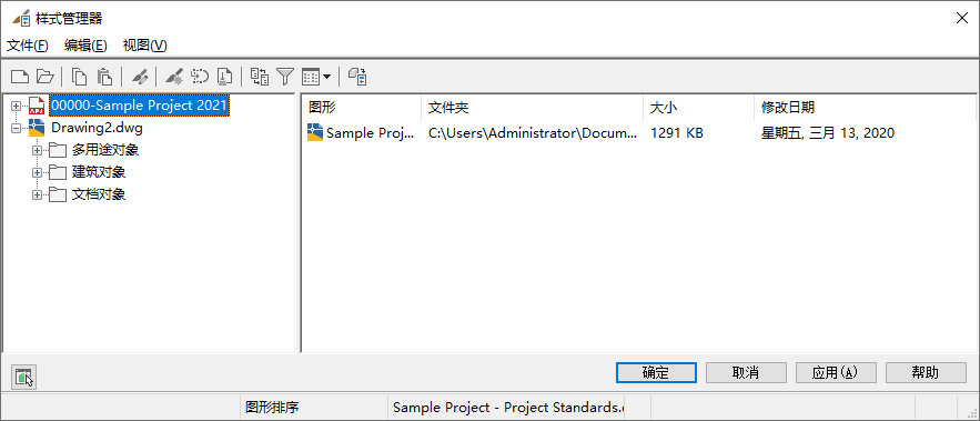 使用以下步骤可修改样式在样式管理器中的排序方式。默认情况下,已打开图形和样板的名称显示在左窗格中的树状视图中。在树状视图中展开一个图形时,该图形中的各个样式将分为 3 种类别:建筑对象、文档对象和多用途对象。如果展开某个类别,各个样式会按照样式类型的字母顺序排列。