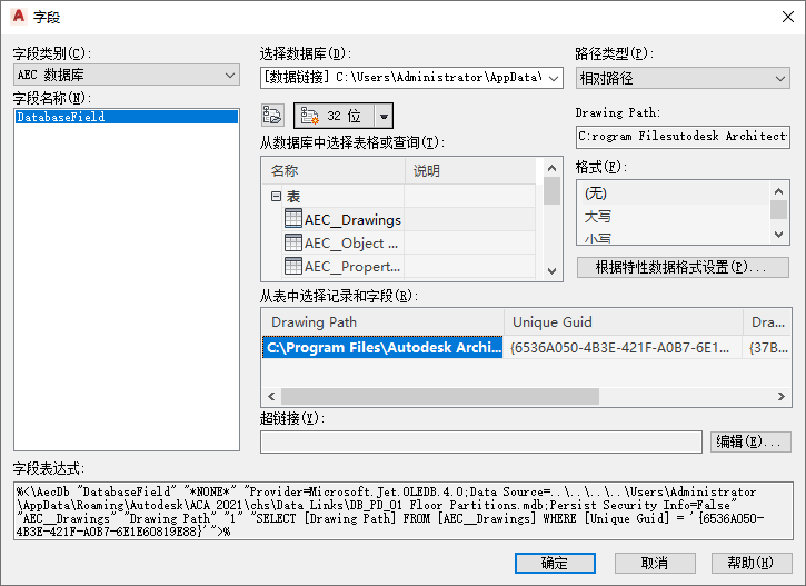 使用以下步骤可以选择要插入到图形中的数据库字段。