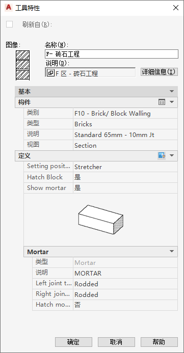 “工具特性”工作表的外观根据构件类型以及特性设置的当前配置的不同而异。下图显示了样例基本工具选项板中包含的“04 - Masonry”工具的“工具特性”工作表的两个配置。该工具设置为在两种配置下添加 3/8" 接缝砖,但是第一个配置的“视图”特性设置为“剖面”,第二个配置的该特性设置为“立面(图案)”。对于可在不同视图中有不同方向的详图构件,“视图”设置决定了用于将图像插入到图形中的具体绘图例程。请注意不同的“视图”设置将导致工作表中不同的方向显示。另外,还要注意灰泥定义不适用于“立面(图案)”设置,因此不会为该配置显示。显示在“定义”下的特性也可能因其他设置的不同而异。例如,如果显示灰泥特性为“否”而“视图”设置是“剖面”,那么不会显示其他灰泥特性。对于某些详图构件,“定义”不适用,因此不会显示该标题。