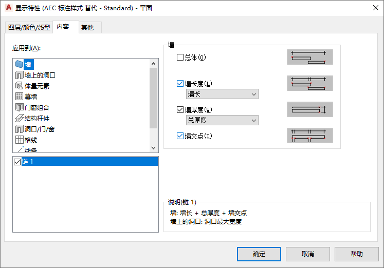示例:在第一条链中,您想要标注墙长和墙交点。为“应用于”选择“墙”。
