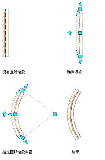 使用此过程可将直墙修改为曲线墙,或将曲线墙修改为直墙。将直墙修改为曲线墙时,软件会在墙段中点添加“曲线第二点”夹点。然后,可以使用该夹点修改圆弧的造型。