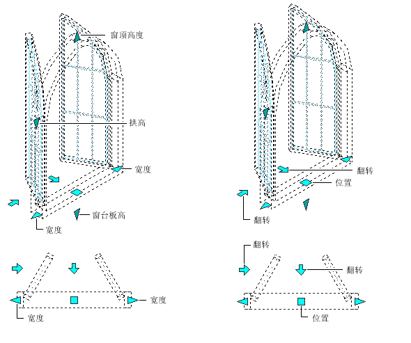 用于修改窗的宽度。 注: 最初,设置夹点的目的是将尺寸约束为针对门样式定义的标准值之一。