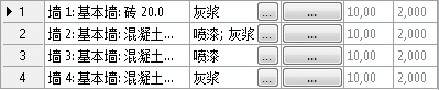 下图所示的 2x4 m 楼层平面(由一个砖墙和三个混凝土墙组成)使用以下墙轴来计算墙表面: