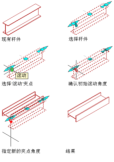 使用以下步骤可以通过指定结构杆件的滚动度数来修改杆件相对于其拉伸轴的方向。若从杆件终点向起点方向观察,可以看到正值使杆件逆时针滚动。
