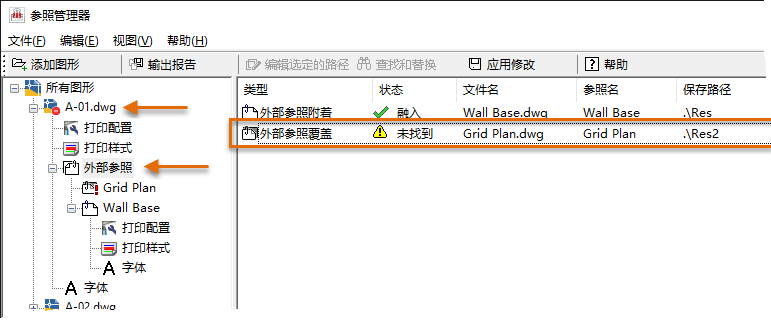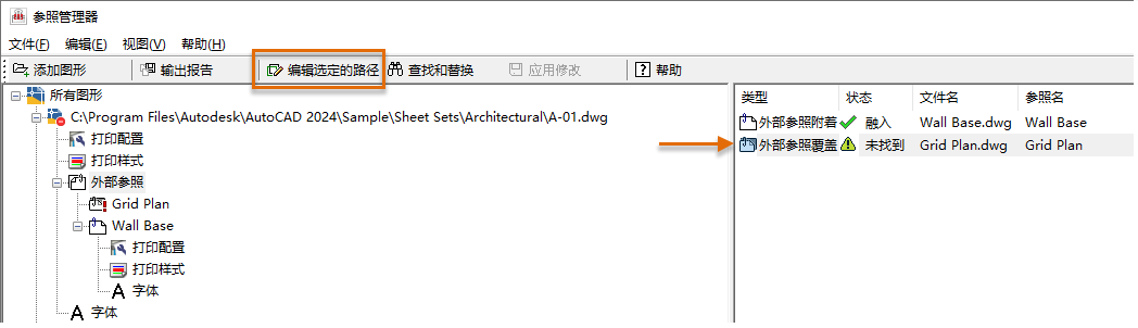 注: 无法使用“参照管理器”替换参照文件的文件名,只可以替换可以找到文件的路径。