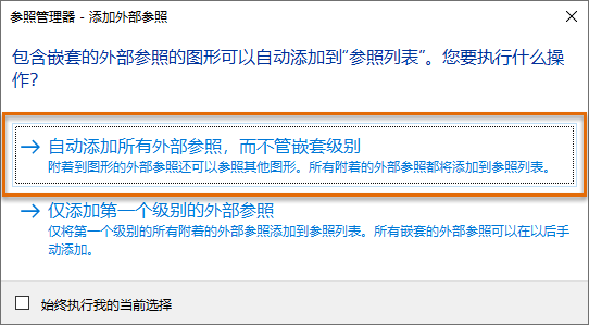 - 在“参照管理器 - 添加外部参照”对话框中,单击“自动添加所有外部参照,而不管嵌套级别”。