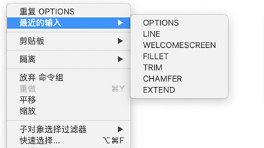 使用快捷菜单上的“最近的输入”重复执行命令或命令输入。 单击鼠标右键以显示快捷菜单。