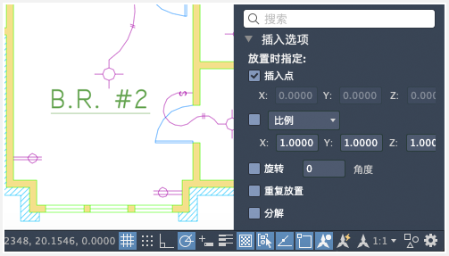 现在,从“块”选项板拖动某个块时将使用“插入选项”中的比例和旋转值。
