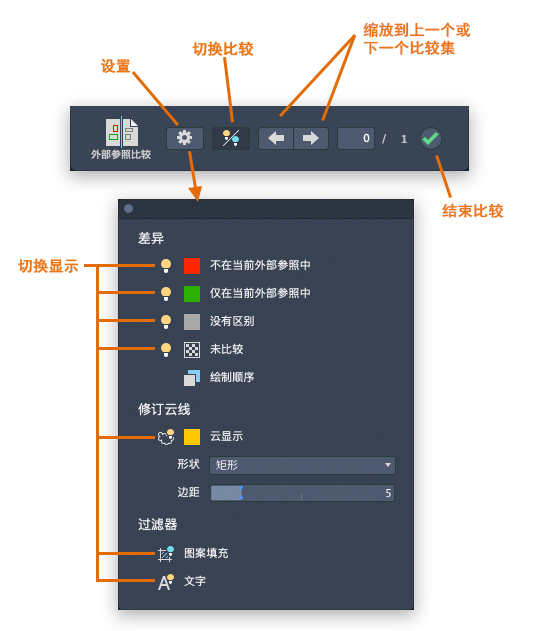 XCOMPARERCPREV - 缩放到外部参照比较结果的上一更改集。