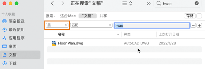 Mac OS 中的聚焦搜索现在支持根据图形内容搜索图形。可以搜索多行文字、多重引线、字段或块属性值。还可以搜索命名对象(例如,块、图层或布局)和系统属性(例如,日期或作者)。