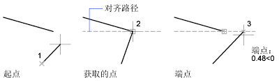 在以下插图中,启用了“端点”对象捕捉。单击直线的起点 (1) 开始绘制直线,将光标移动到另一条直线的端点 (2) 处获取该点,然后沿水平对齐路径移动光标,定位要绘制的直线的端点 (3)。