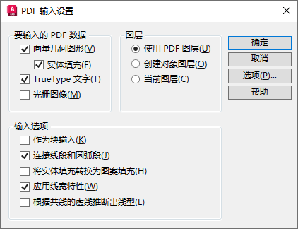 设置相关选项,以便从指定的 PDF 文件输入几何图形、填充、光栅图像和 TrueType 文字对象。