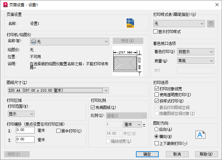 打印布局时,将打印指定图纸尺寸的可打印区域内的所有内容,其原点从布局中的 0,0 点计算得出。