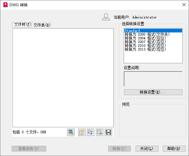 显示选定用于转换的图形文件列表。其中包括图形名和路径、当前格式以及转换状态。可以通过单击“添加”按钮或拖动文件添加图形文件。还可以通过单击列标题排列图形的次序。