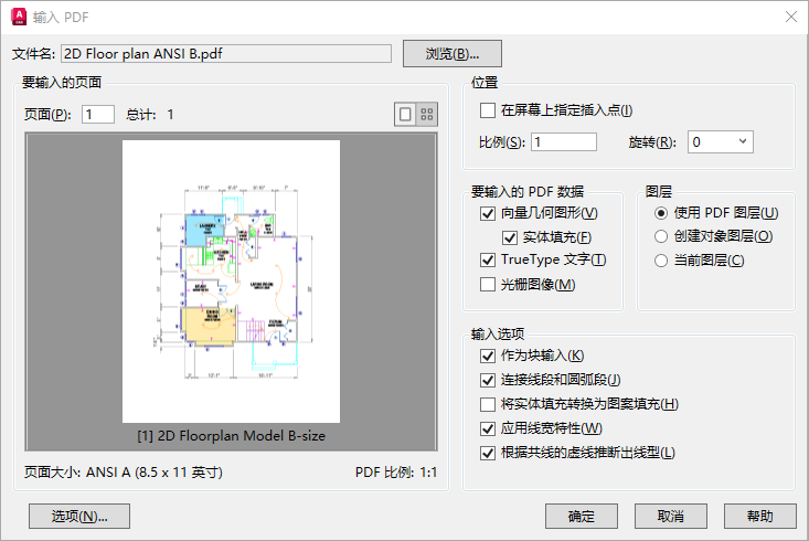 - 您可以为输入的对象指定不同的输入比例因子。从 PDF 文件输入页面时,不使用 INSUNITS 系统变量的设置,因为每个页面的比例可能有所不同。