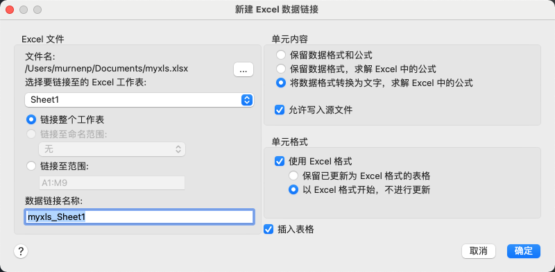 “新建 Excel 数据链接”对话框