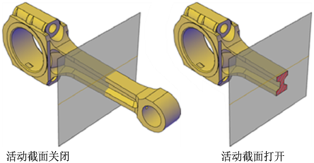使用活动截面,可以通过移动和调整截面平面来动态分析三维对象的内部细节。可以指定隐藏还是切除位于截面平面指示器一侧的模型部分。