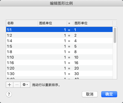 显示当前已定义的比例的列表。当附着外部参照时,也显示输入的临时比例缩放。如果可以复制比例名称,但具有不同的值,则可以在名称中附加数字。