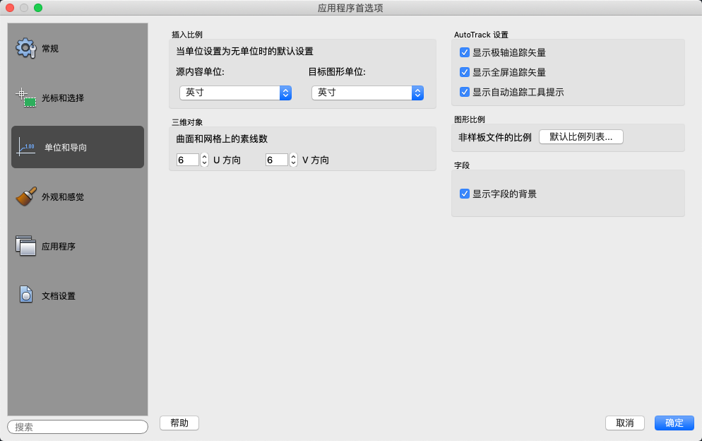 “单位和导向”选项卡(“应用程序首选项”对话框)