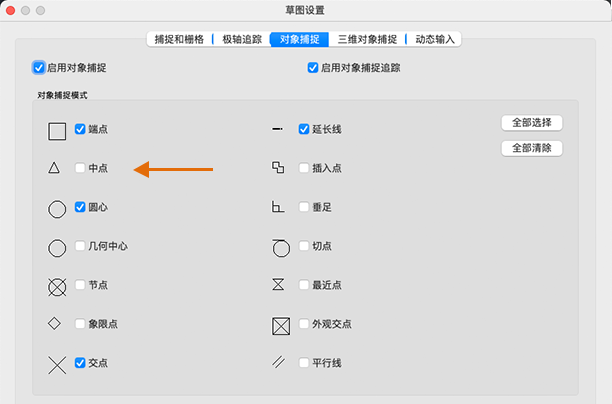 输入 OSNAP 命令以设置默认对象捕捉,也称为“运行”对象捕捉。例如,您可能会发现,默认启用“中点”对象捕捉很有用。