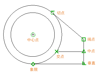 到目前为止,在对象上指定精确位置的最重要方式是使用对象捕捉。在下图中,通过标记来表示多个不同种类的对象捕捉。