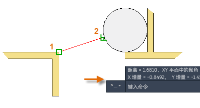 在命令执行期间,可以从对象捕捉位置水平和垂直对齐点。在下图中,首先将光标悬停在端点 1 上,然后悬停在端点 2 上。光标移近位置 3 时,光标将锁定到水平和垂直位置,如图所示。