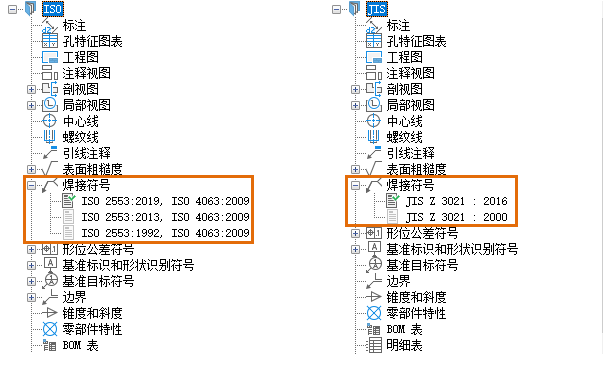 焊接符号现在支持最新的 ISO (ISO 2553:2019) 和 JIS (JIS Z 3021:2016) 标准修订。