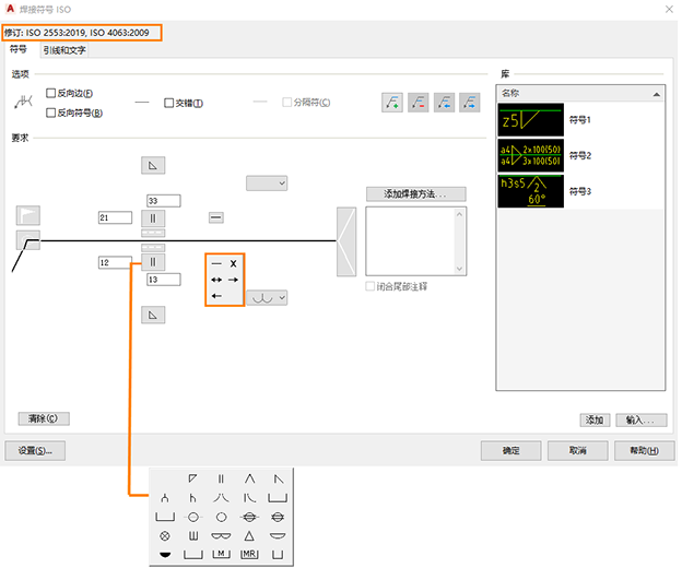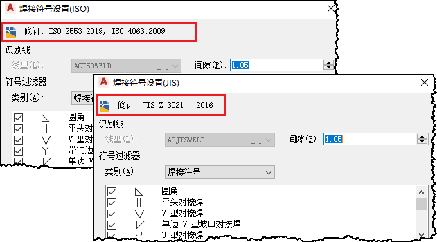 “焊接设置”对话框将显示最新的 ISO 和 JIS 修订。“符号”过滤器中还列出了对应的焊接和打底符号。