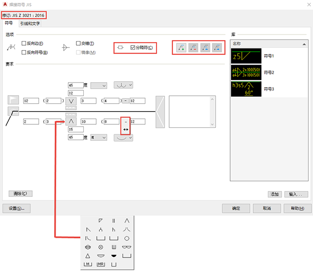 此外,“焊接符号 JIS”对话框还包含用于多参考线支持的新分隔符和控件。