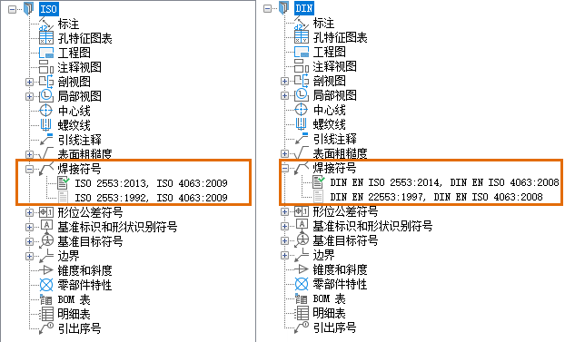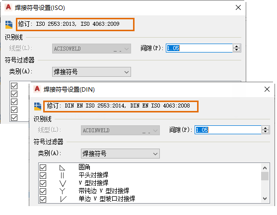增加了对新 ISO 和 DIN 标准修订的支持后,您可以使用最新修订的焊接标准对在 AutoCAD Mechanical 工具集中创建的文档进行注释。尽管您可以在新文档中使用最新修订,但 AutoCAD Mechanical 工具集将继续支持旧版修订,以允许打开、编辑和保存在早期版本中创建的文档。