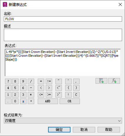 此表达式还假定曼宁方程式中的“n”值为 0.013(这是混凝土管道的标准)。事实上,对于曼宁方程式中的“n”值,管道已有已命名组件,可以设置该组件。但是,将该组件添加到表达式会产生不想要的结果,因此用户不应将其用于此过程。