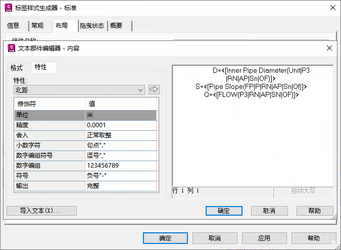 下一步是为平面和纵断面创建显示此流量值的管道标签样式。图 12 显示了此标签样式的样例,其中包含所有相关水力设定: