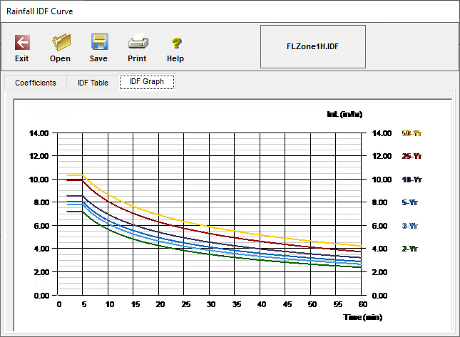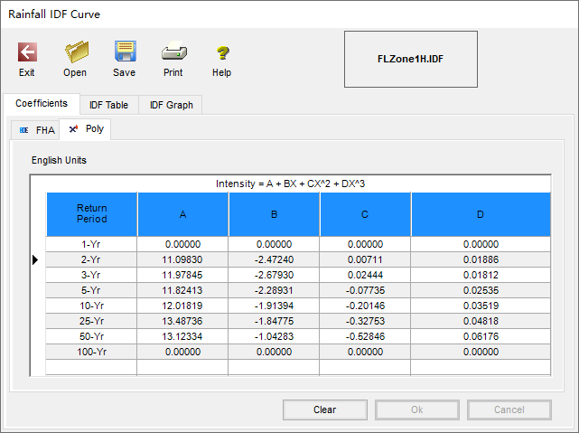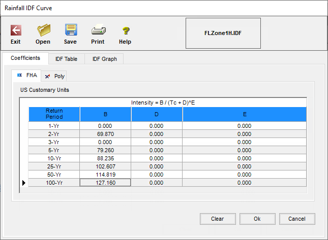 方程式的系数为 B、D 以及 E。您应当将 D 和 E 的值设为零 (0)。B 值代表强度,单位是英寸/小时。 单击对话框底部的“确定”以保存更改。