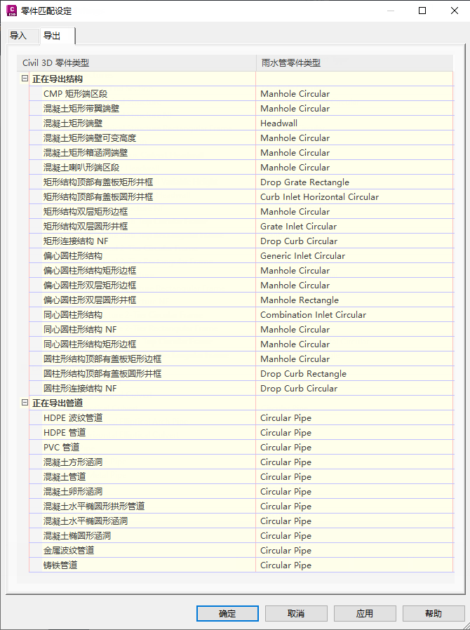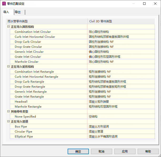 从 Storm Sewers 中将数据导入和导出到 Autodesk Civil 3D,然后又导入回 Storm Sewers 中时,存在默认零件匹配限制。