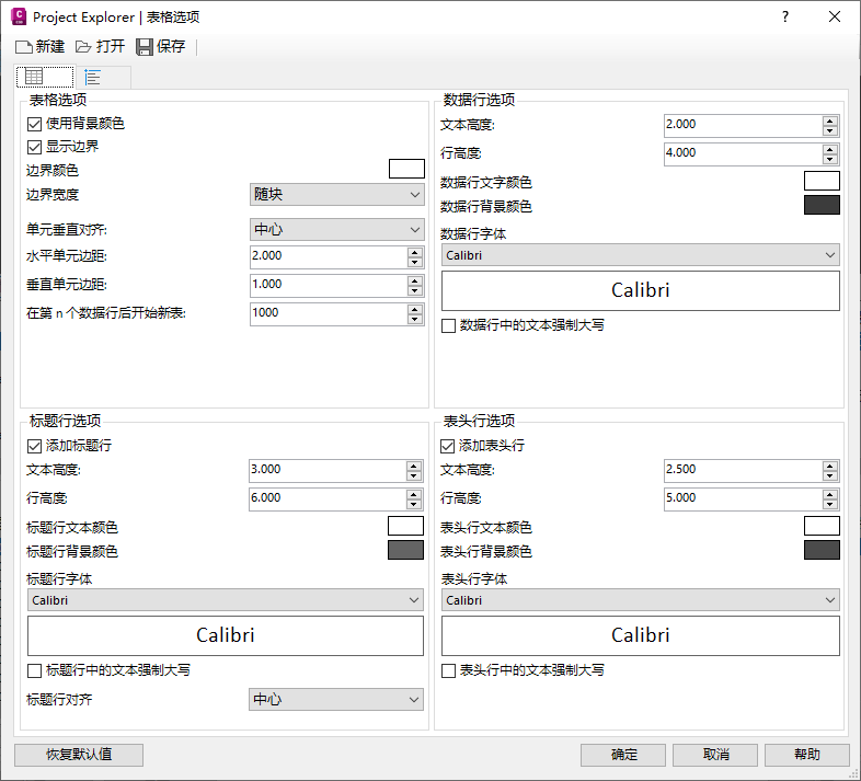 “表格选项”可确定从 Project Explorer 生成的所有 AutoCAD 表格的边框颜色、字体大小和类型、单元边距以及常规视觉样式。