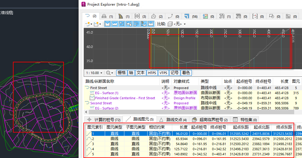 在 AutoCAD 视口中进行缩放、平移或临时亮显的键盘快捷键还适用于许多 Civil 3D 对象的子对象层级。例如,使用上面列出的键盘快捷键,可以: