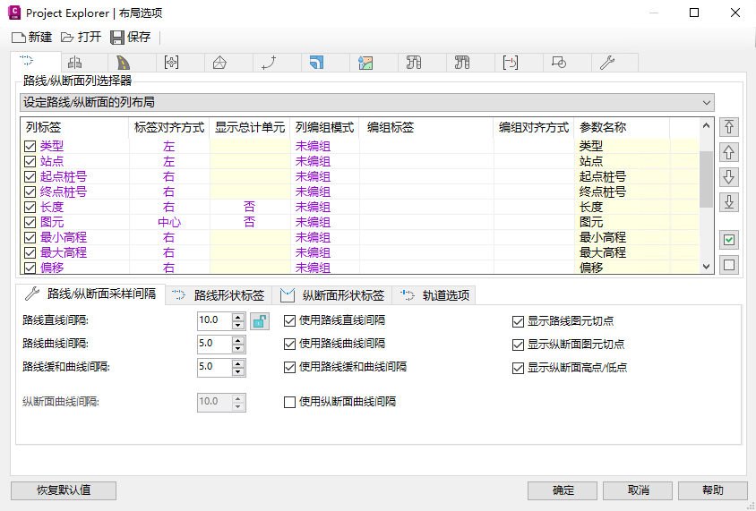 除了标准列布局和标签选项外,“布局选项”窗口中的“路线”选项卡还提供了一系列专用选项,用于控制与路线和纵断面相关的桩号和图元数据的显示和格式。