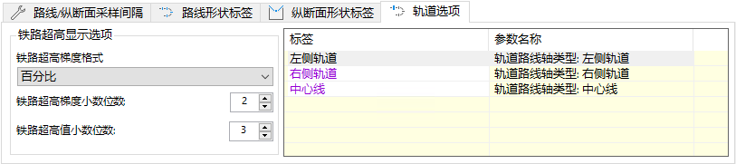 “轨道选项”选项卡具有铁路超高显示选项和标签列表。您可以使用“铁路超高显示选项”框来控制“铁路超高曲线”选项卡中的“铁路超高梯度”值。使用标签列表可以编辑图形中轨道标签的名称。在“轨道选项”对话框中编辑标签后,“Project Explorer”主窗口、“路线”选项卡、“计算的桩号”列表和“轨道轴类型”中的标签会更新。