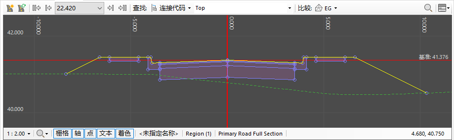 “道路”选项卡中的道路视图可显示在桩号或链测长度位置范围内穿过选定道路的动态横断面。使用道路中可用桩号的向前/向后箭头或下拉列表,以选择要在其位置显示横断面的桩号。然后,可使用工具栏中的“查找”选项在道路视图上亮显特定点、连接或造型代码。可以从下拉列表中选择代码,或者针对需要亮显多个代码的情况,可采用逗号分隔列表的形式将代码键入字段中。