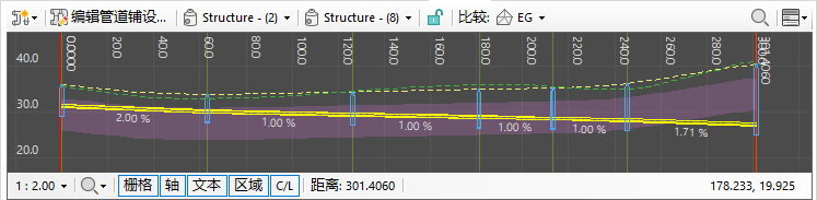 “管网”选项卡中的管道铺设视图可显示沿选定管网中两个结构之间最短管道路径的动态纵断面。使用工具栏中的下拉结构列表可选择管道铺设的起点和终点结构。使用“编辑管道铺设”选项可调整显示在当前管道铺设中的任何管道的坡度。