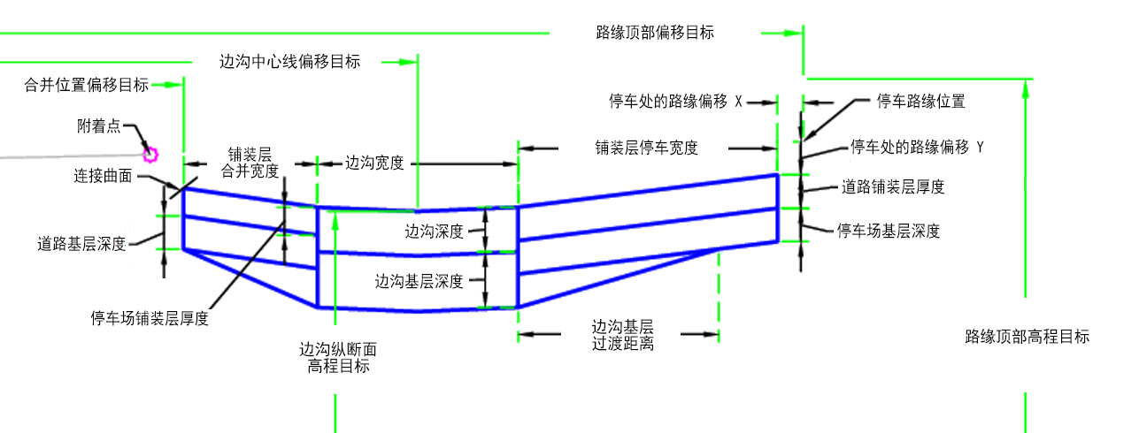 | 边沟纵断面 | 用于确定边沟的中心线高程。以下对象类型可用作用于指定高程的目标:纵断面、三维多段线、要素线或测量地物。 | 必需 |