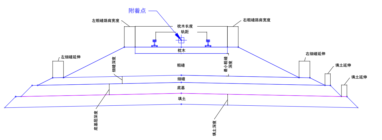 | 粗碴边坡(左侧和右侧) | 粗碴材质侧的坡度。粗碴材质顶部的坡度应与铁路超高造成的枕木坡度相一致。 | 坡度(非负数) | 2:1 |