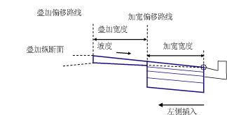 附着点将确定加宽部分外侧边缘的偏移和高程。加宽部分内侧边缘以及叠加部分内侧边缘的位置将使用给定的宽度和坡度来确定。路线可用于替代给定的数值宽度。如果给定了叠加纵断面,则将计算叠加部分内侧边缘处的纵断面高程与附着点之间的坡度。